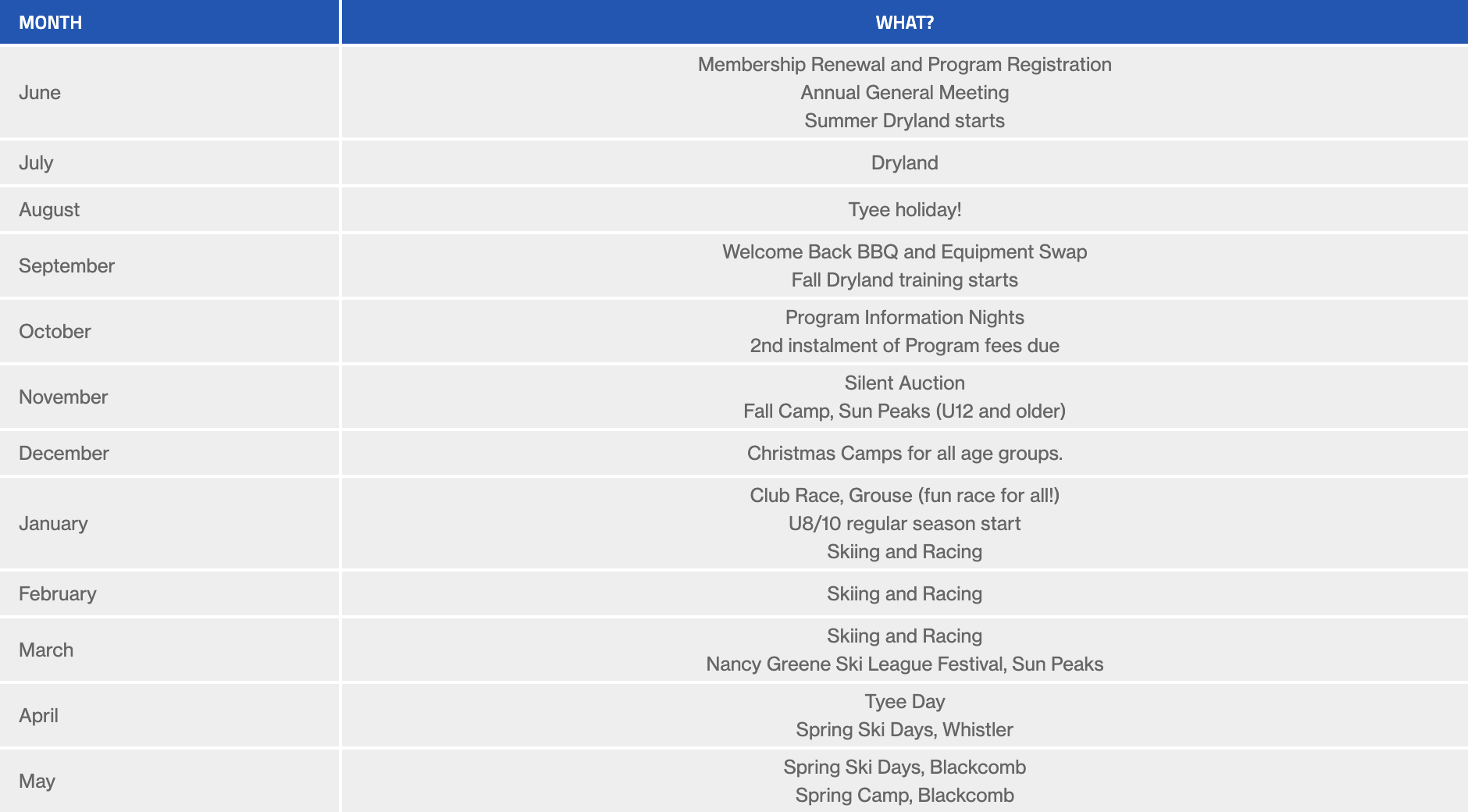Every year our program changes to suit the conditions both on and off the hill. However, generally our season follows this schedule.